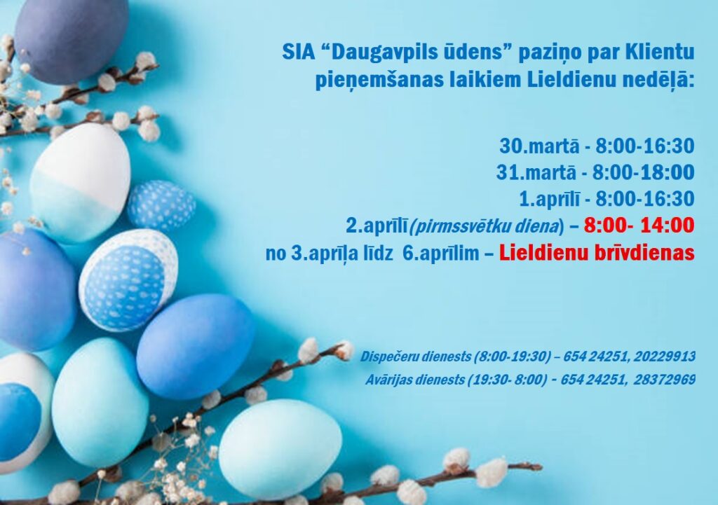 SIA „Daugavpils ūdens ” aicina klientus savlaicīgi plānot Klientu apkalpošanas centra apmeklējumus, ņemot vērā izmaiņas pieņemšanos laikos Lieldienu nedēļā.